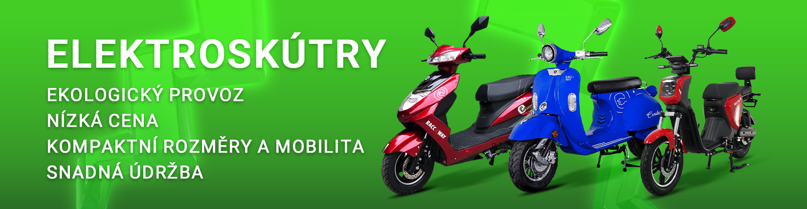 V našem sortimentu elektrických skútrů cílíme na značkové elektroskútry RACCEWAY . Vybírat můžete z různých modelů, které se liší designem i výkonem. Pokud hledáte elektroskútr bez řidičáku , rovnou prozkoumejte naše modely retro elektroskútrů e-Babeta a e-Fichtl , které můžete bez obav prohánět i bez řidičského oprávnění.