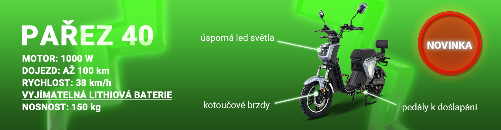 PAŘEZ 40 nudi snažan 1000 W motor bez četkica koji će vas s lakoćom podići do brzine od 38 km/h. Zaboravite na brige s dometom, s litijskom baterijom težine samo 11 kg, koja se puni 4-6 sati, možete prijeći do 70 km, a u optimalnim uvjetima čak i do 100 km! Baterija je izmjenjiva, tako da je lako možete napuniti kod kuće ili na poslu.