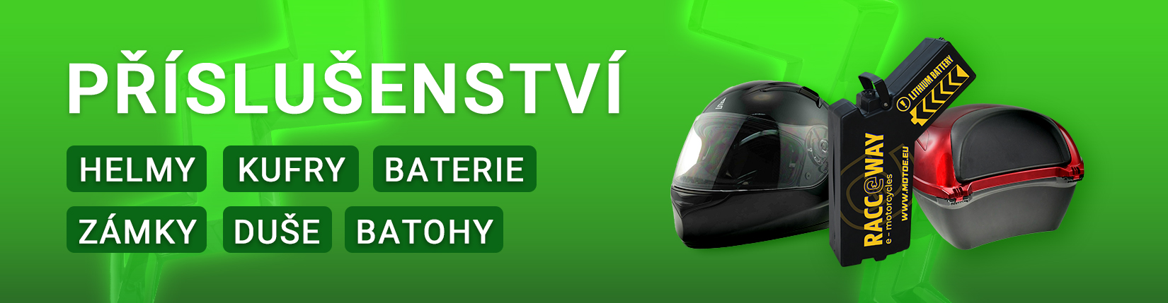 V našem sortimentu příslušenství a doplňků k elektrickým skútrům naleznete náhradní baterie k elektrickým skútrům RACCEWAY (jak olověné, tak lithiové baterie), dále samostatné zadní nosiče a přídavné zadní kufry ke vybraným modelovým řadám elektroskútrů RACCEWAY. Volit můžete z mnoha dostupných designů.