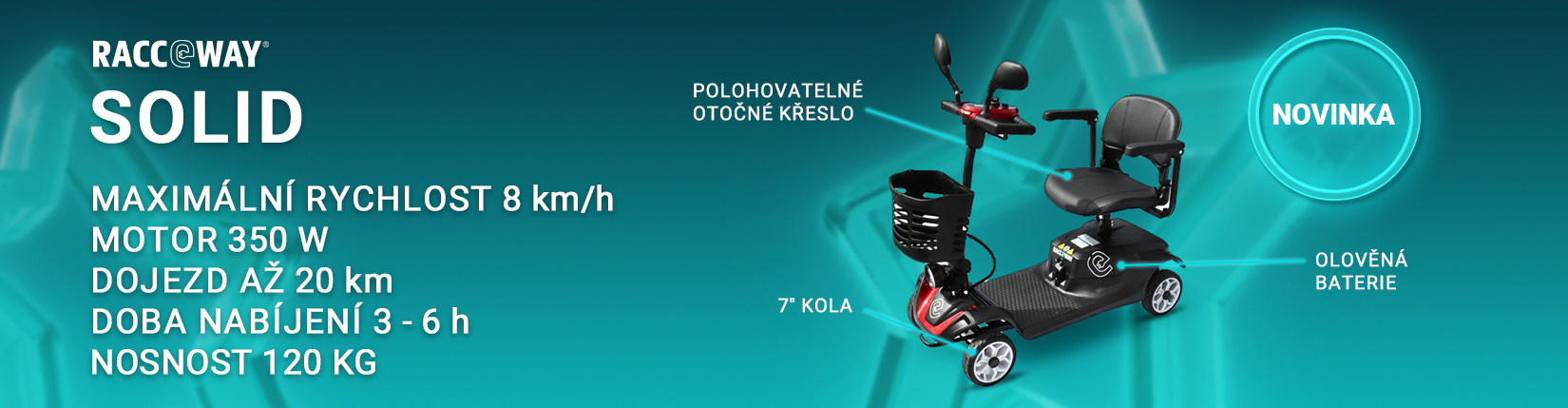 Elektrické vozítko Racceway SOLID je ideální řešení pokud máte vy nebo vaši blízcí potíže s chozením. Díky otočnému křeslu snadno nastoupíte a čtyři 7´´ kola zajistí stabilitu při jízdě. Výkonnný 350 W elektrický motor si poradí i s kopcovitým terénem do 12 stupňů sklonu. Vozík SOLID má vepředu praktický košík na nákup či drobné věci a zpětná zrcátka zajistí vyšší bezpečnost i v provozu. Elektrický vozík SOLID má nosnost 120 kg a je plně odpružený. Výhodou je také možnost jeho snadného složení pro převod v kufru auta.